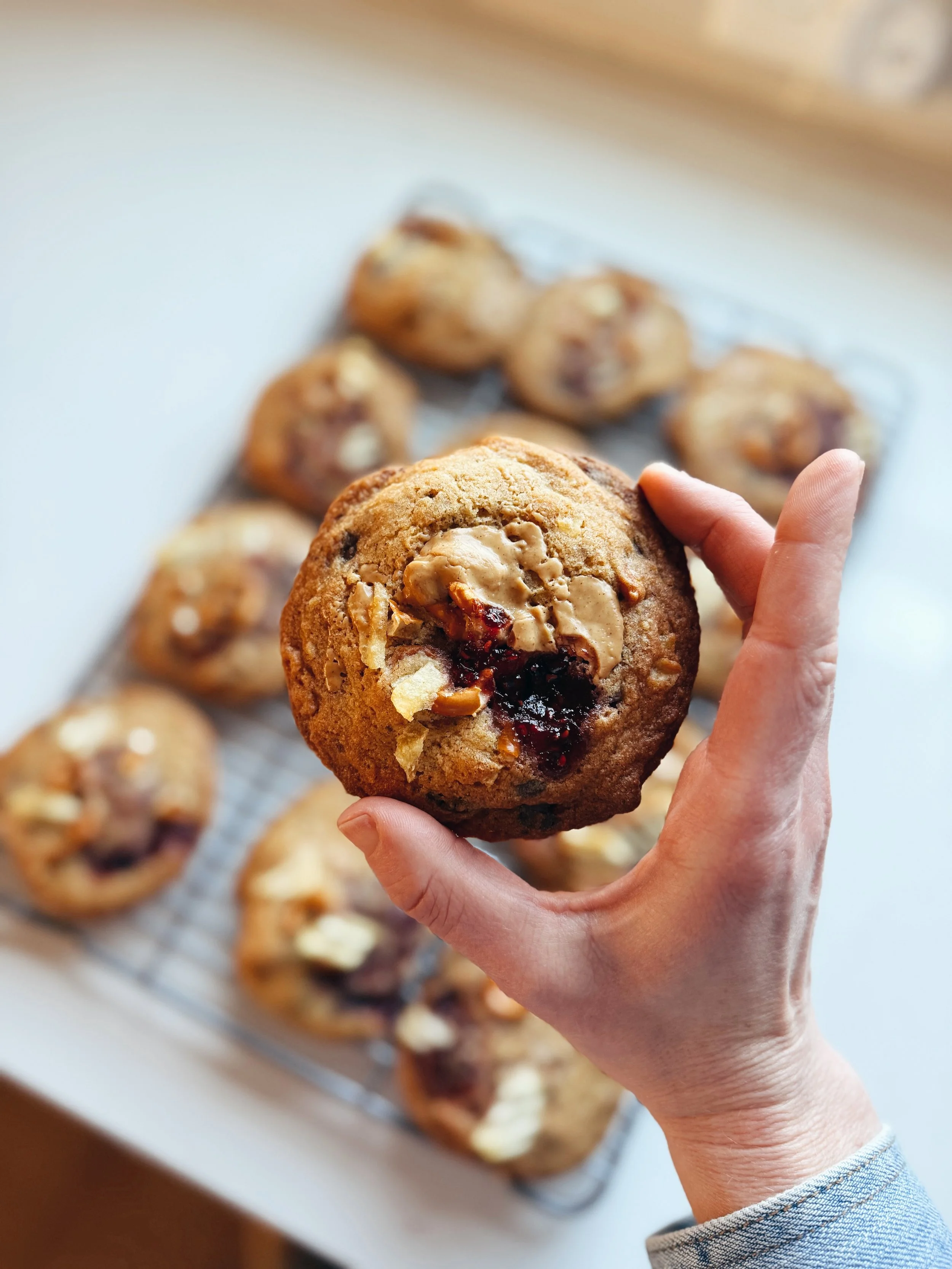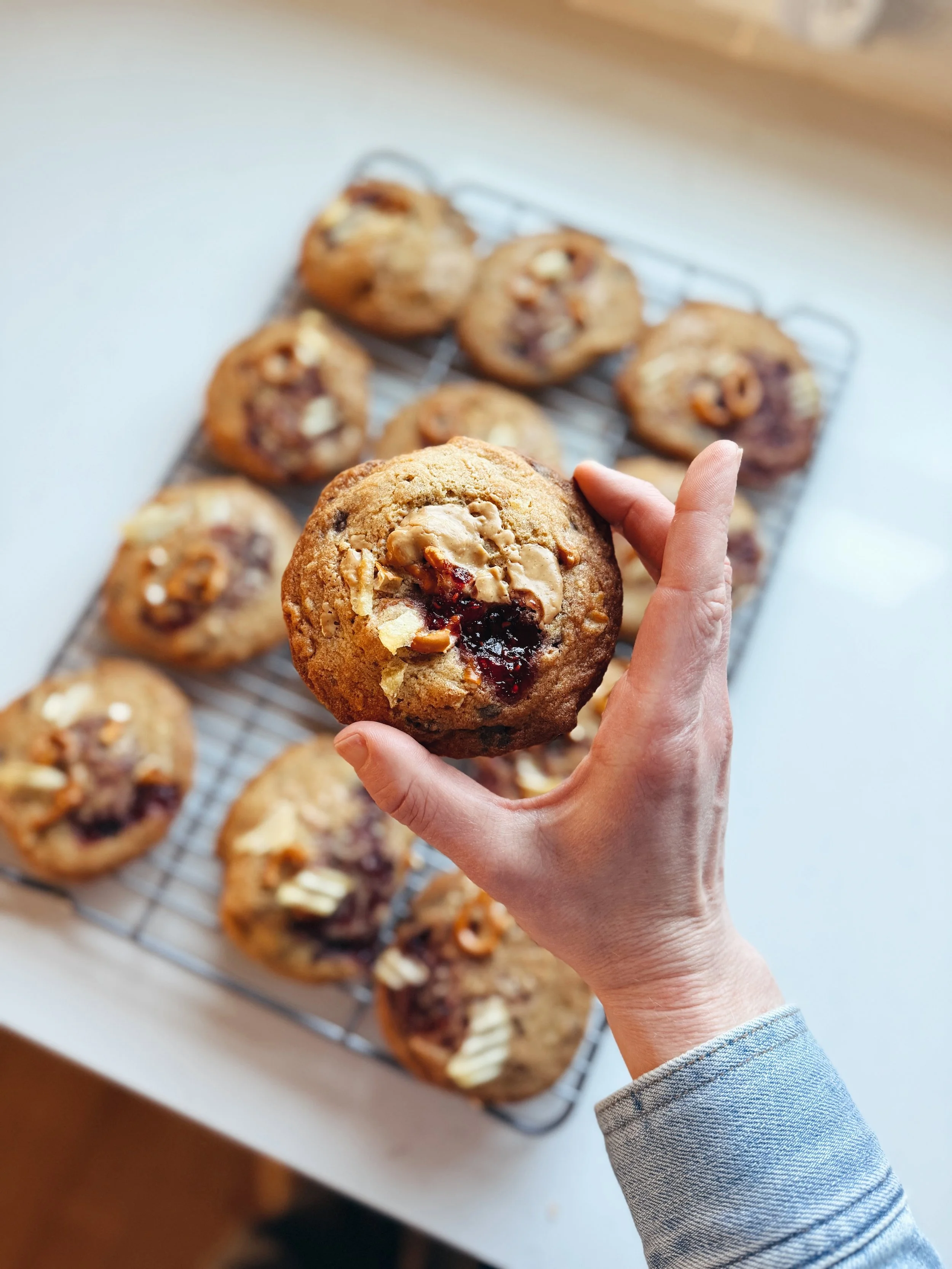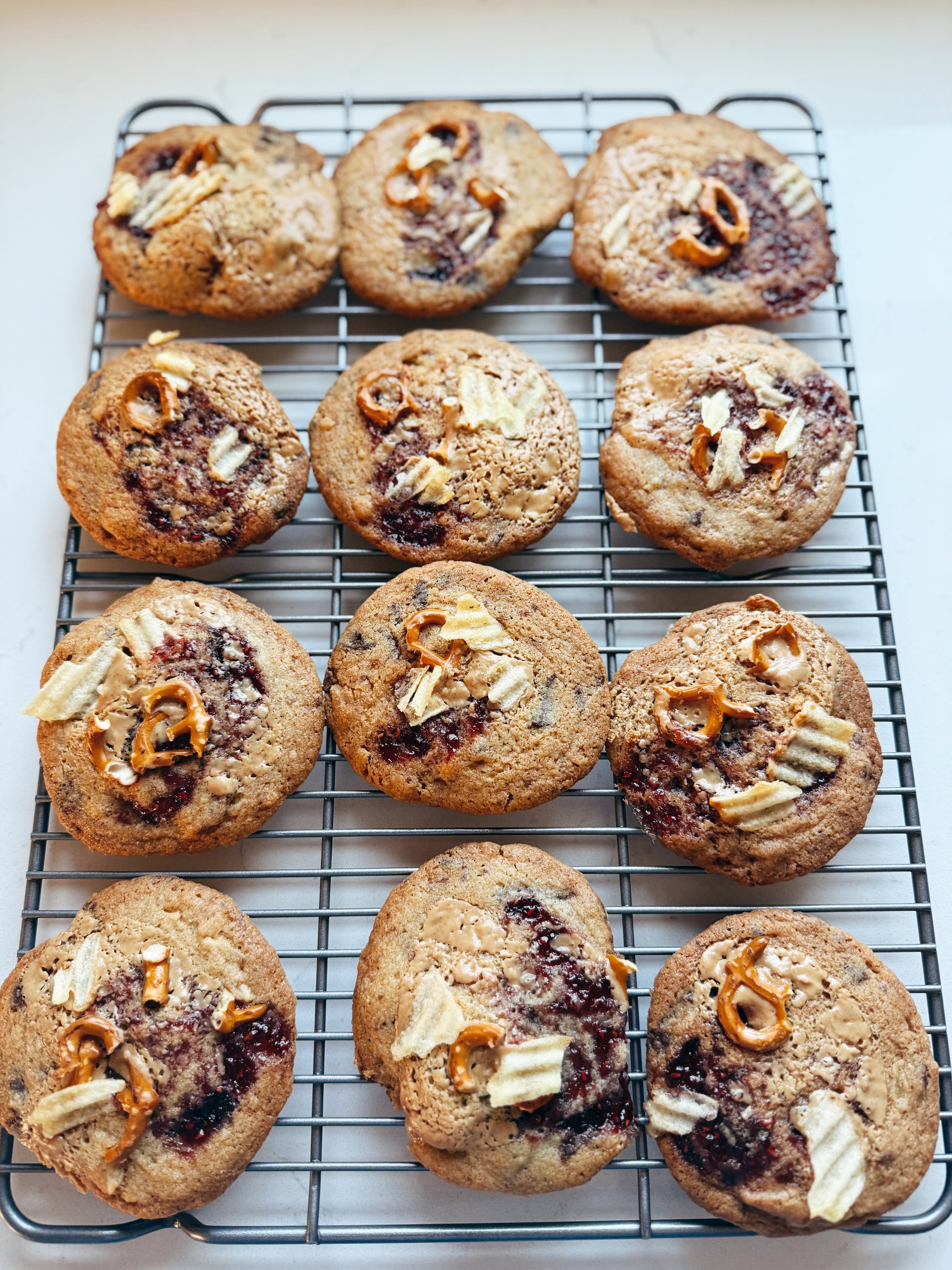 Use a cookie scoop close to 1/4 cup in size to ball up the dough the + place the balls on the prepared baking sheets. Use your palm to gently flatten the dough. Top each cookie with 1 tsp of peanut butter, a 1/2 tsp of jam, and then sprinkle some remaining chips + pretzels over the top (I like to smash a larger chunk of each into the top of each cookie). Place the prepared cookie sheet in the freezer for 10 minutes before baking. Bake the cookies for 15 to 18 minutes - rotating + smacking the pan at the 10 minute mark.