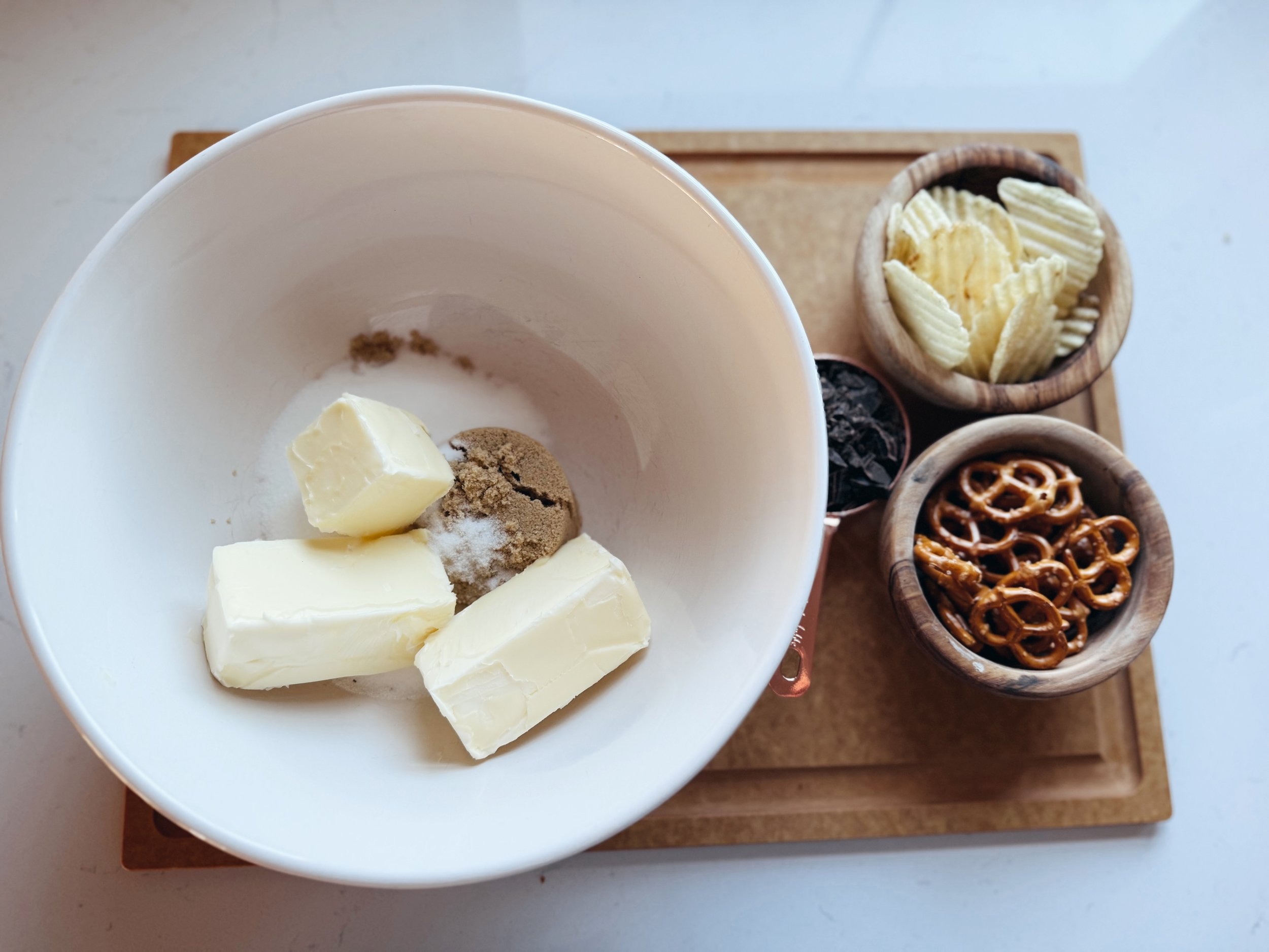 Add the butter + sugar to a stand mixer and cream everything together at medium speed for 2-3 minutes. Add in the egg + egg yolk, mixing until the eggs have been thoroughly mixed in. Add in the baking soda, salt + half of the flour. Mix on low until the flour is fulled mixed in. Add the rest of the flour and continue to mix on low, gradually increasing the speed to medium until the dough is smooth, and appears light + airy. Add in the chocolate chunks + a half cup each of the pretzels and chips. When the mix-ins having been incorporated, place the dough in the fridge for 30 minutes.