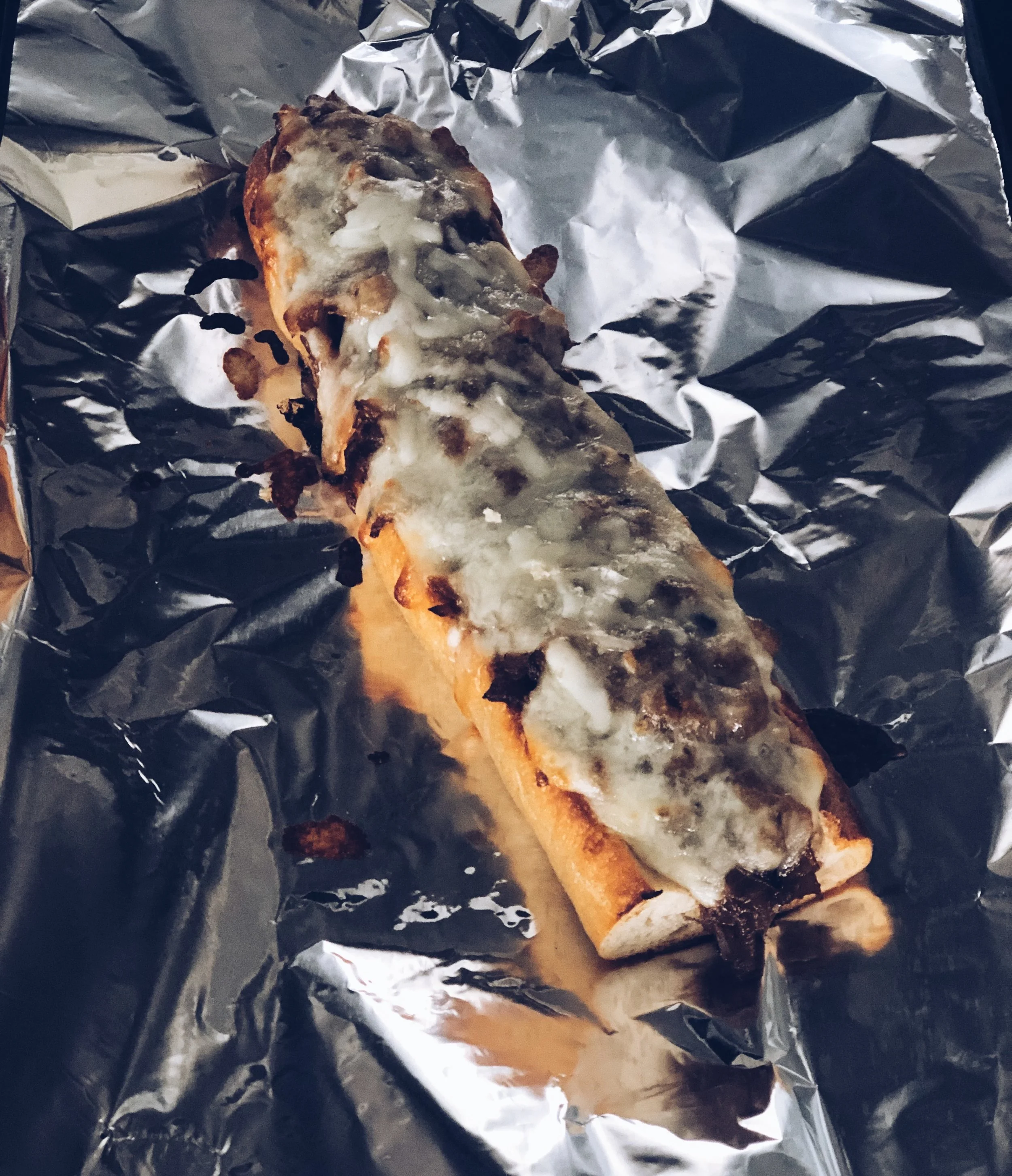 Start by whipping up the pull apart bread. Preheat the onion to 350. Cut the top off of the baguette, avoid cutting the baguette in half, and hollow out the baguette to create a "boat" with your baguette. You can remove 80% of the bread, leaving the crusted edges and a bit of buffer to create the desirable boat affect. Sprinkle a thin layer of the mozz on the bottom baguette (about a 1/4 cup), and then add in half of the onion mixture. Sprinkle the remaining mozzerella on top of the onion mixture. Bake the entire bread boat in the oven for 8-10 minutes, or until the cheese has melted and slightly browns.