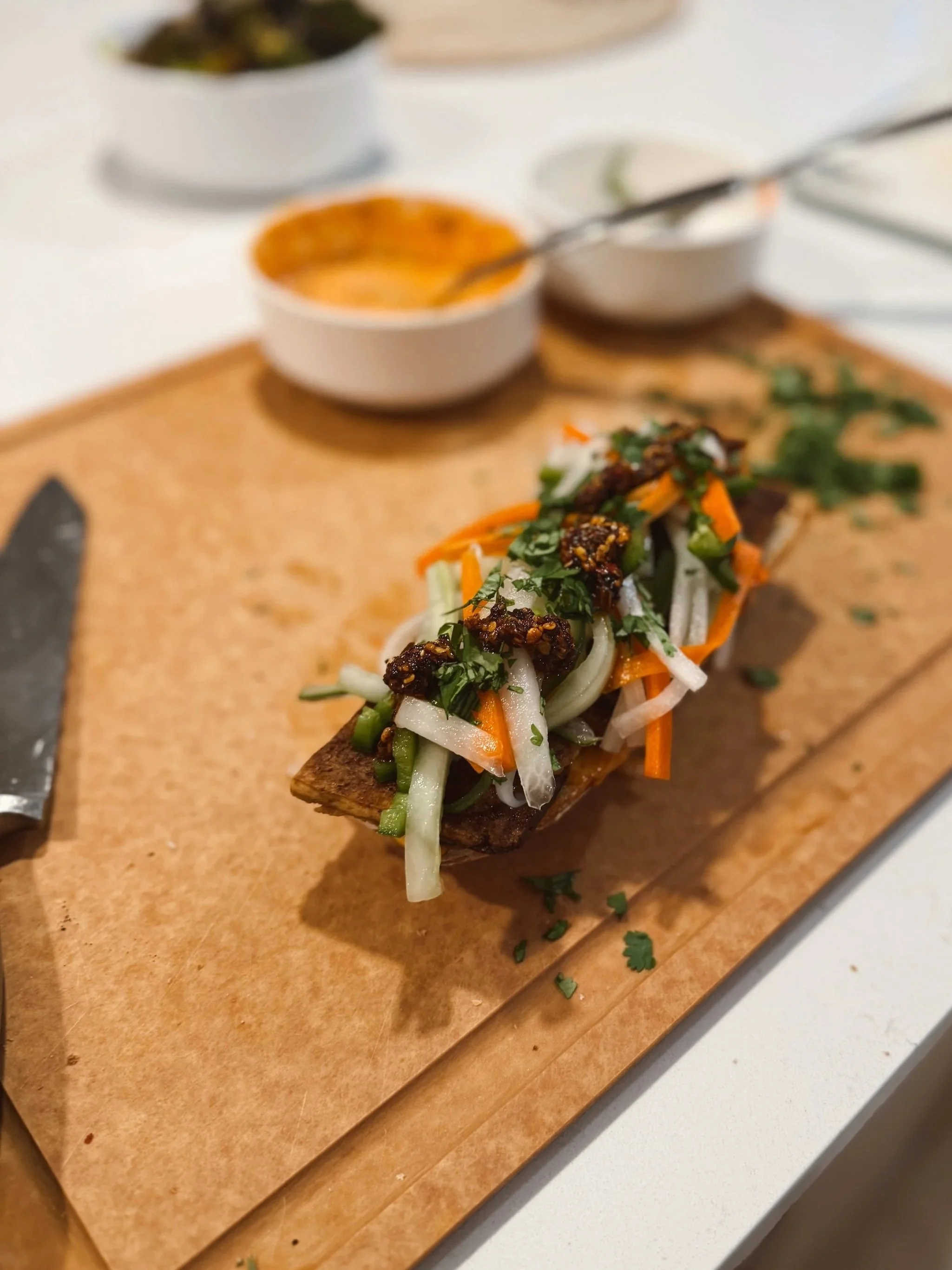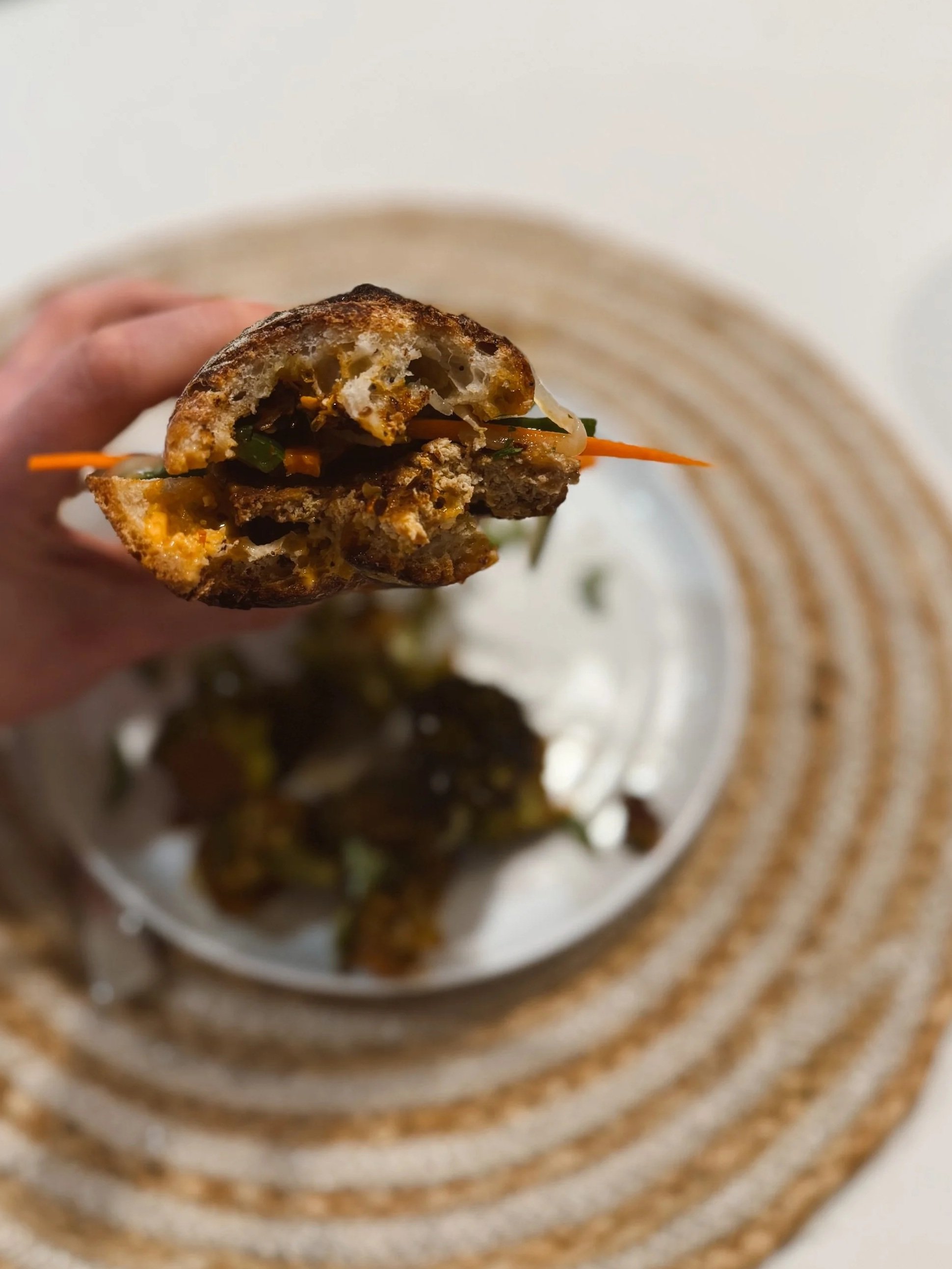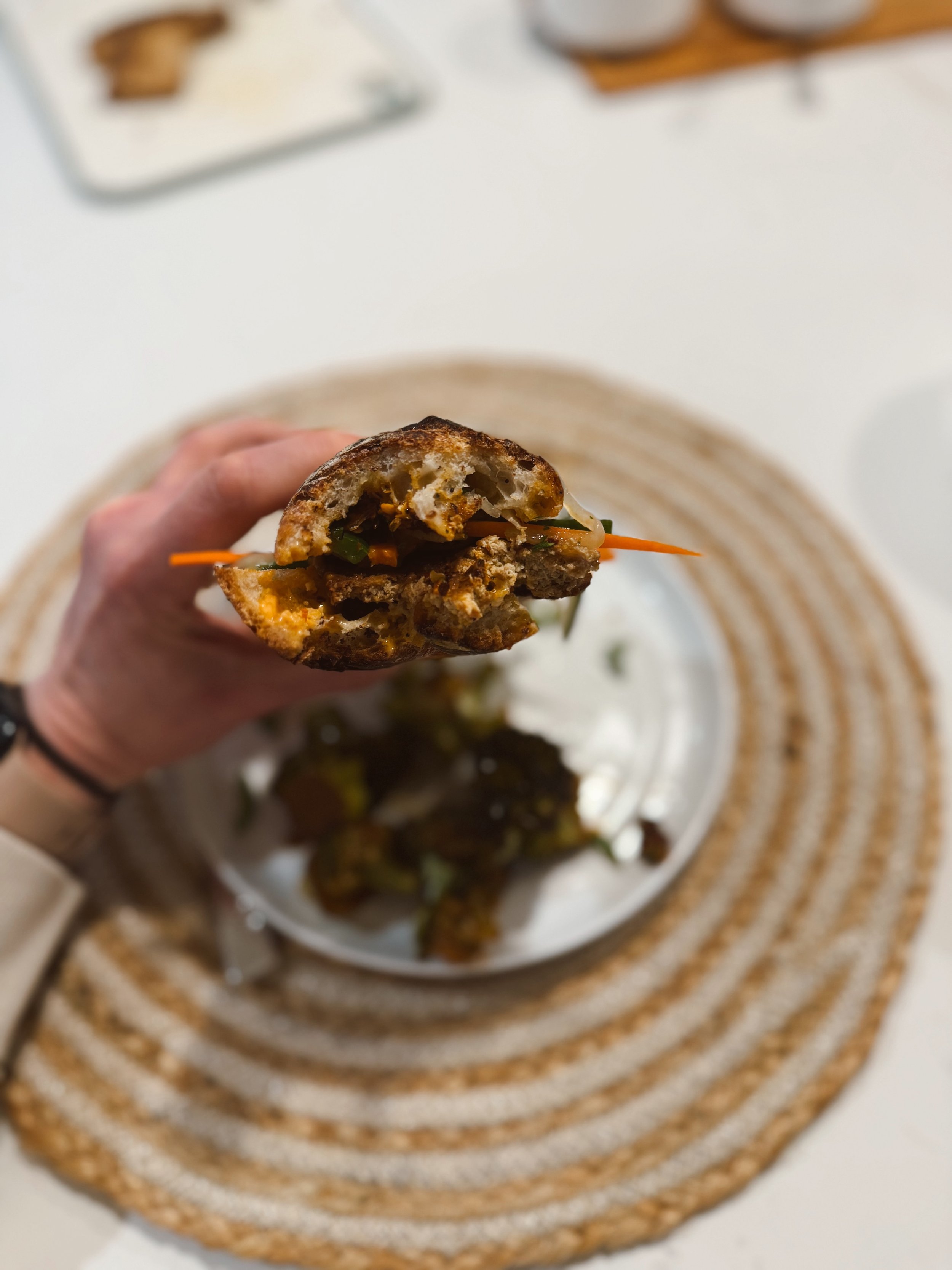 We’re back in our sourdough era over here. Jordan is whipping up lots of fresh sourdough these days, so weeknight veggies sandwiches are kind of where it’s at. I had my mind set on trying our hand at Banh Mi’s sometime this season, & when he whipped up some sourdough baguettes I was officially putting these sandwiches on our weeknight dinner line-up. We loved them so much we made then a 2nd time, and we both got to look like barbarians together while we ate them. Our take-away was to leave our cloth napkins in cupboard - these sandiwches + all there juices were a job for disposable paper towels only.