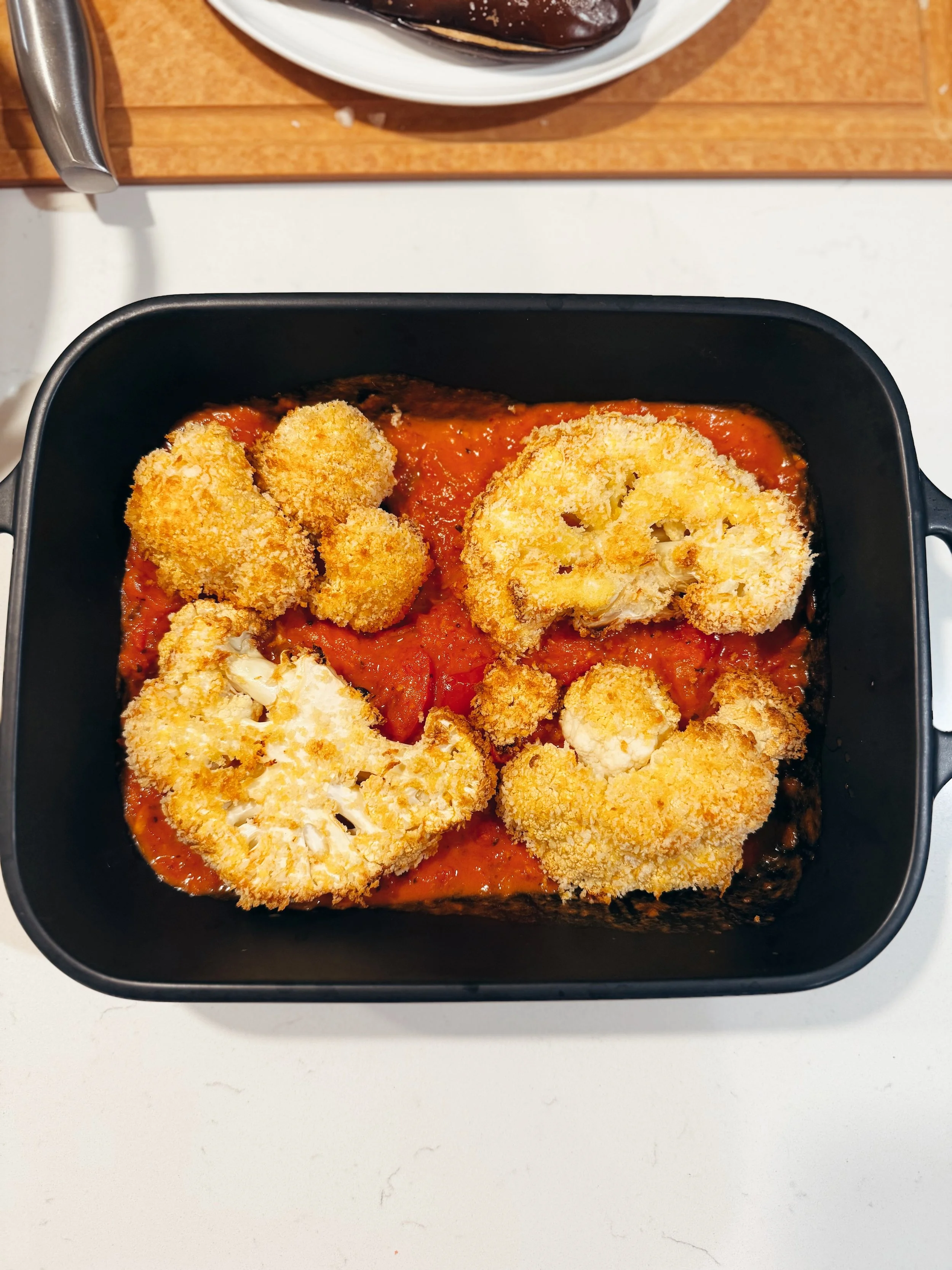 So in the spirit of “you can cauliflower that” comes our first cook of the New Year - Cauliflower Sorrentino. Taking a classic chicken dish + subbing in cauliflower for an almost meat free dinner experience. Big cauliflower steaks get breaded + baked, and then assembled to make this big + delicious Italian casserole style meal. The prepared cauliflower is topped with prosciutto (lord knows I’m not skipping the prosciutto), eggplant, and a lot of cheese. Then it’s all baked with a vodka sauce. Fun, sauce-y, delicious, and an ideal Italian meal in my book.