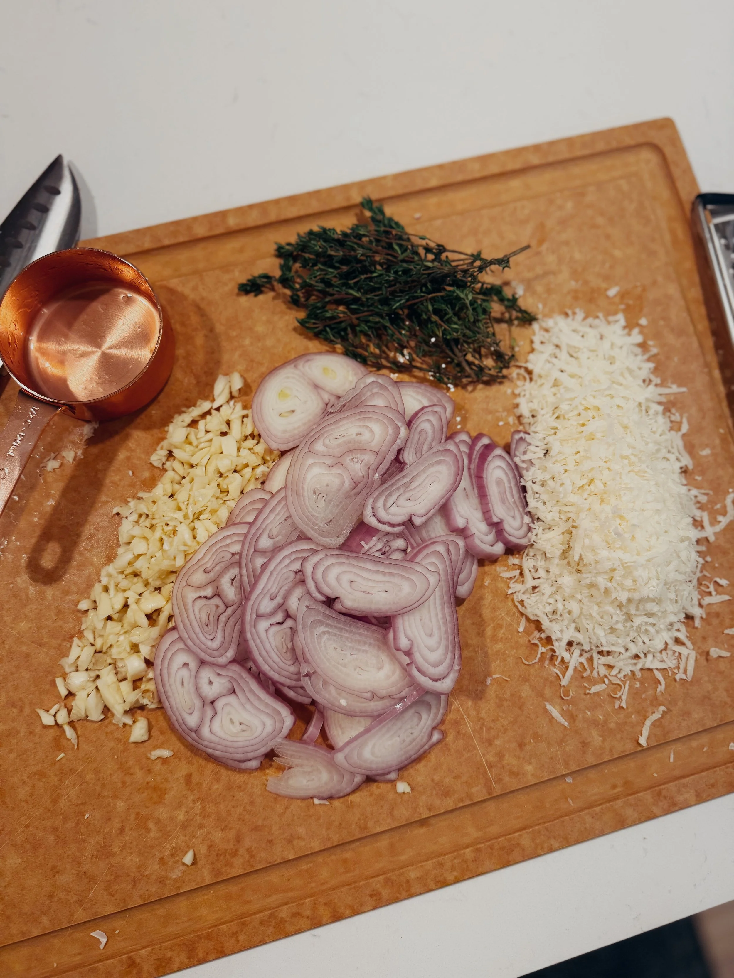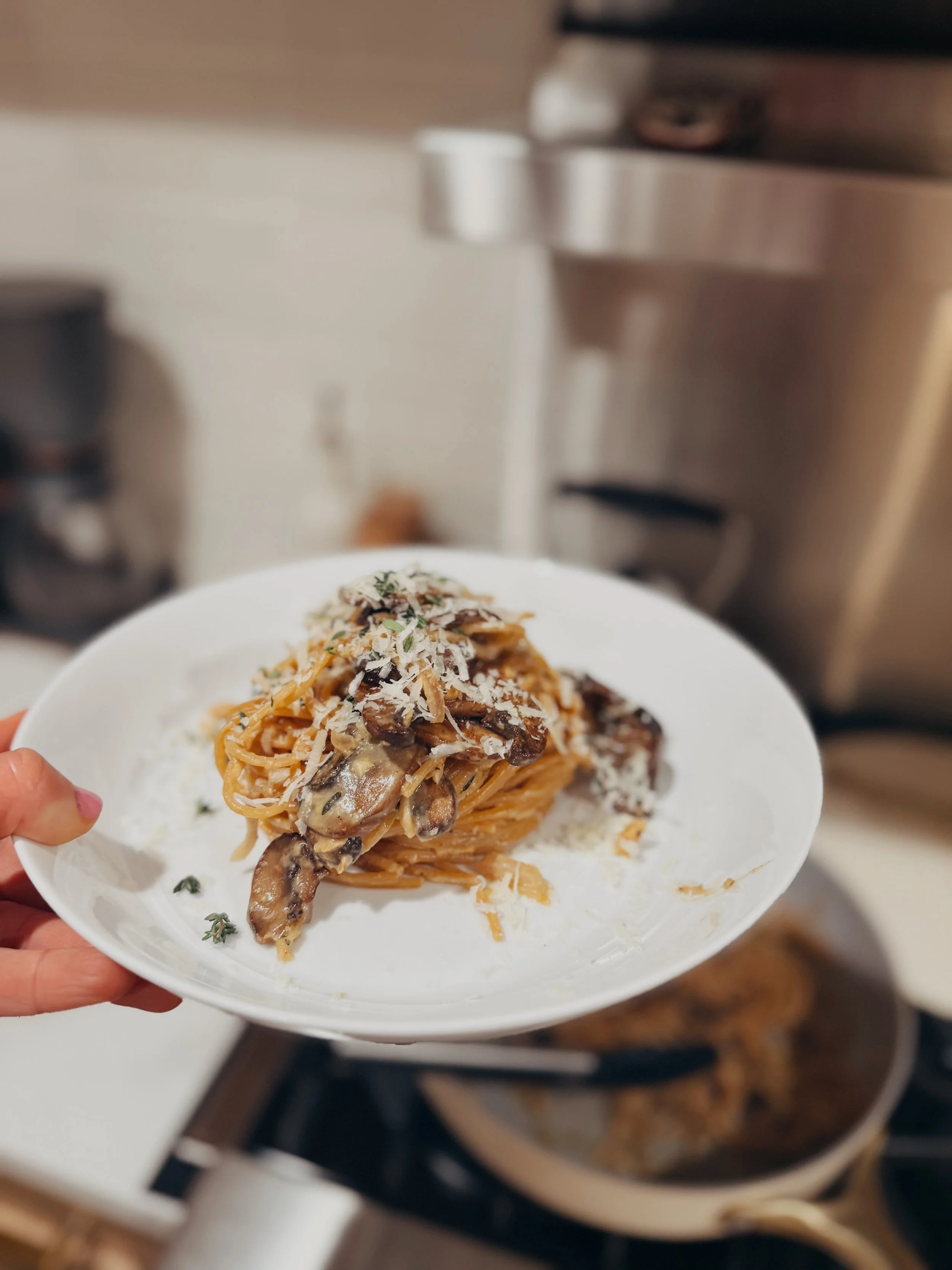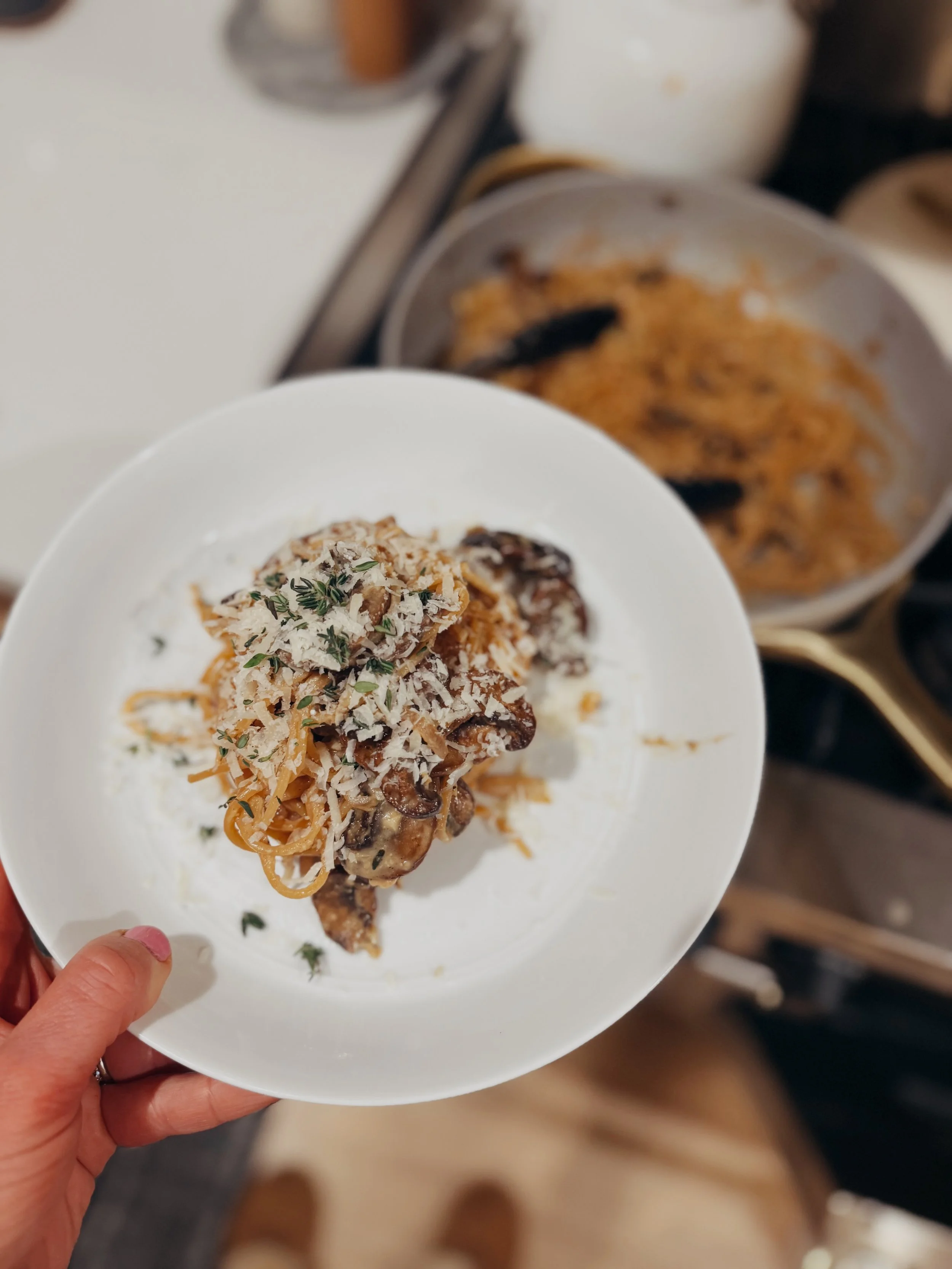 If you can do anything when it comes to prepping mushrooms for a pasta dish, it is brown them in butter. It’s one thing I really took away from Julia Child - anything cooked in butter is just better. This is a concept that is very applicable to cooking mushrooms. Browned, crispy, seasoned with salt, pepper, and thyme - the best combination. I can’t get away with not eating a couple pieces straight out of the pan.