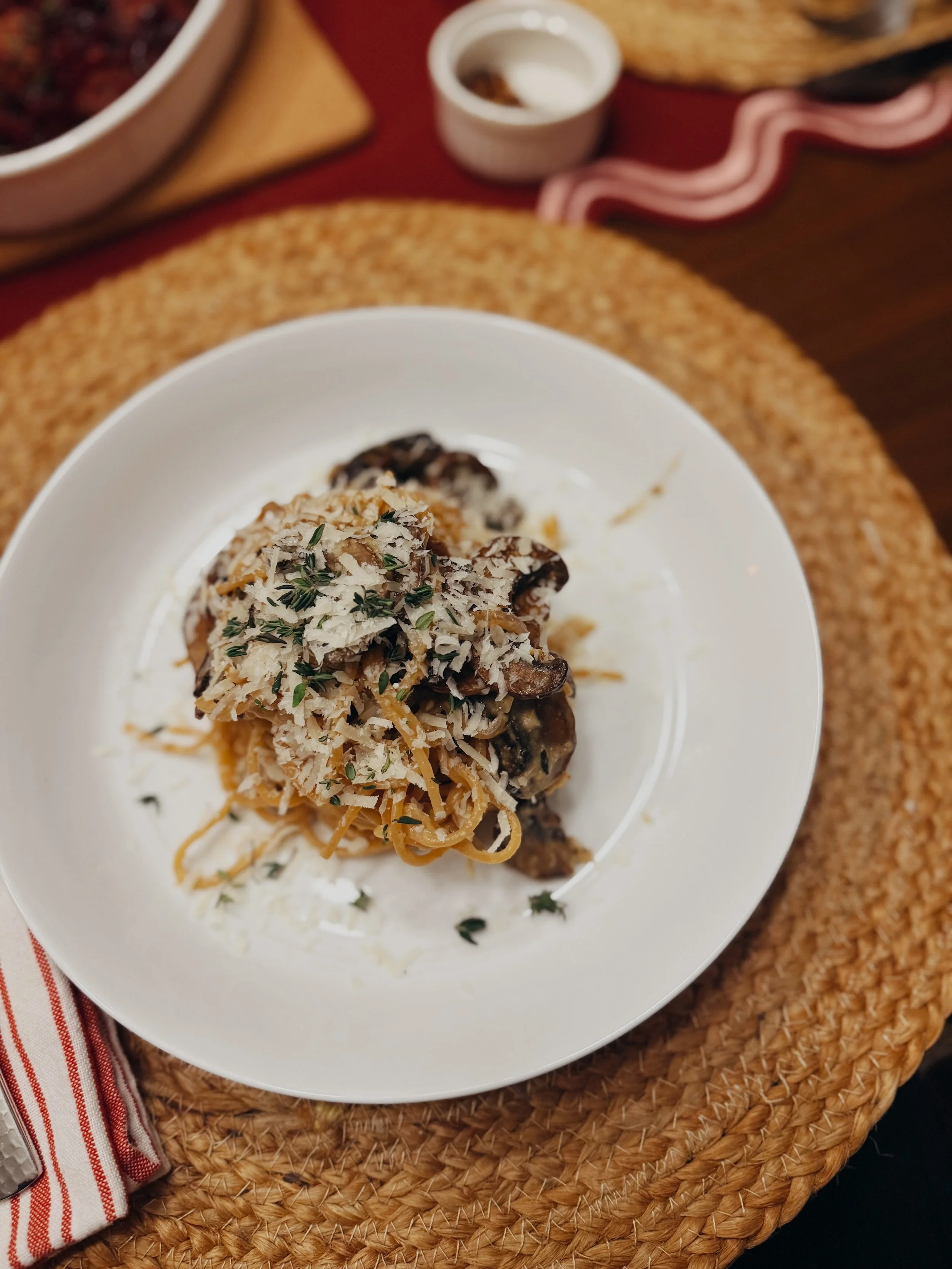 We rallied, made it over the hump of our 2026 illnesses, and finally made time to enjoy this dinner we tagged as our “final holiday hoo-rah” meal. Something we deemed a bit fancy + worthy of enjoying amongst our holiday tablescape, and it did not disappoint. This Mushroom + Miso-Mustard Pasta is so dang good! Perfectly savory, buttery and swimming in a sauce that’s equal parts interesting + delicious. The flavor is just a fun surprise - not really anything I’ve had in a pasta style dinner. I mean mustard and miso in a pasta sauce? It just sounded so out there but also so intriguing (plus I am currently obsessed with miso), so I just had to try it. And so glad I did! One of the best non-basic, non-red sauce pasta dishes I’ve ever made!
