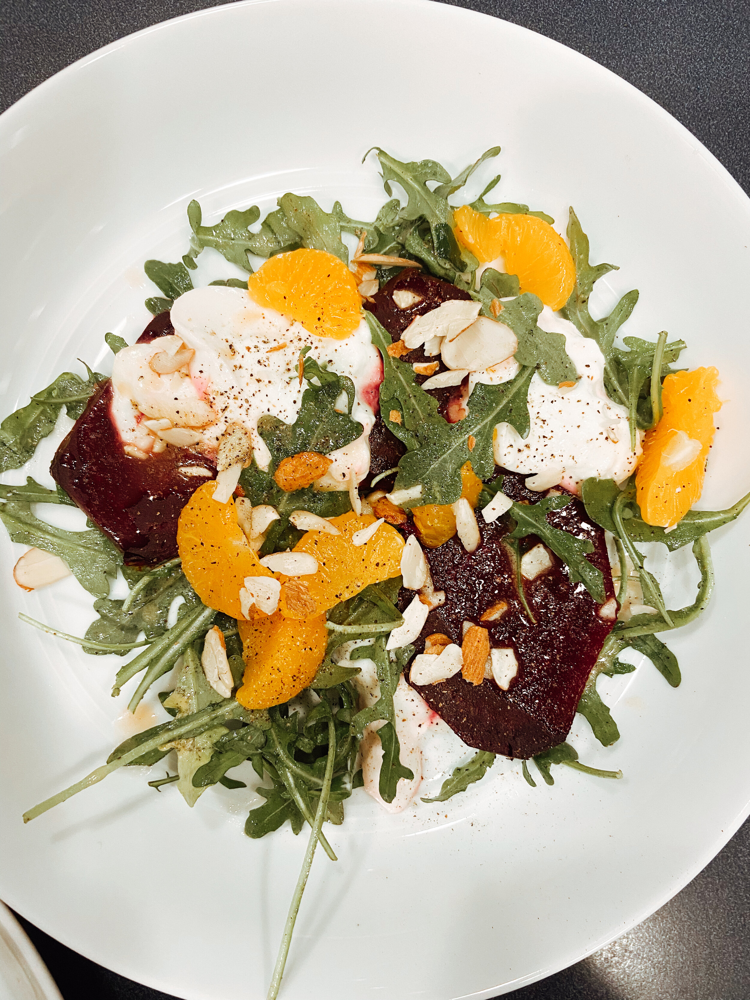 Toss the arugula with a couple tablespoons of the dressing so the greens are lightly dressed, and separate into serving bowls. Slice the beets & the burrata, both about 1/4 inch thick. Split the beets and cheese amongst the plates. Add a few orange segments and a sprinkle of almonds. Spoon about another teaspoon or two over the salad to finish.