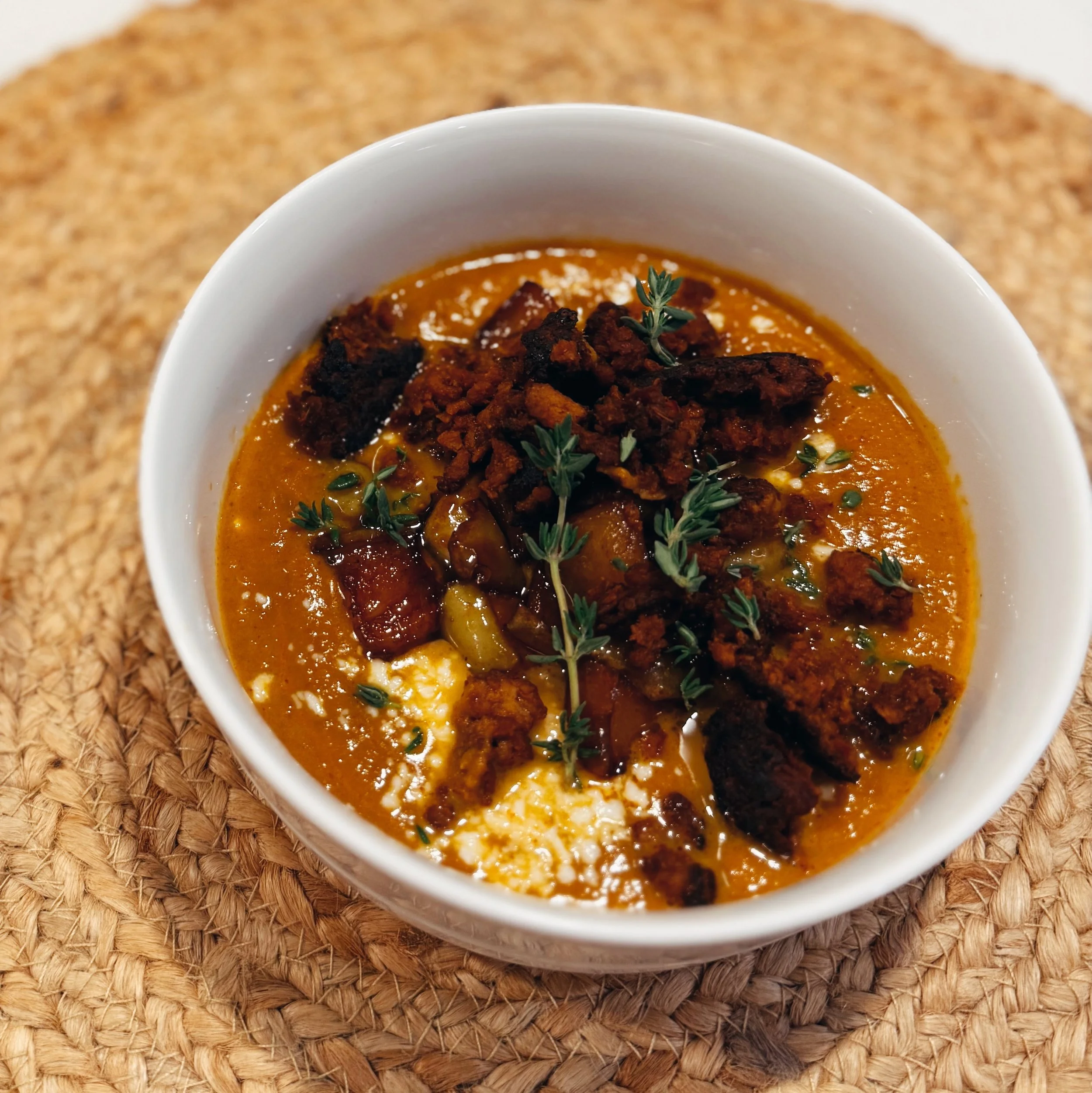Serve the soup in warmed bowls with a scoop of the cooked apples + chorizo on top. Top with some fresh thyme + a little extra cheese, and enjoy.