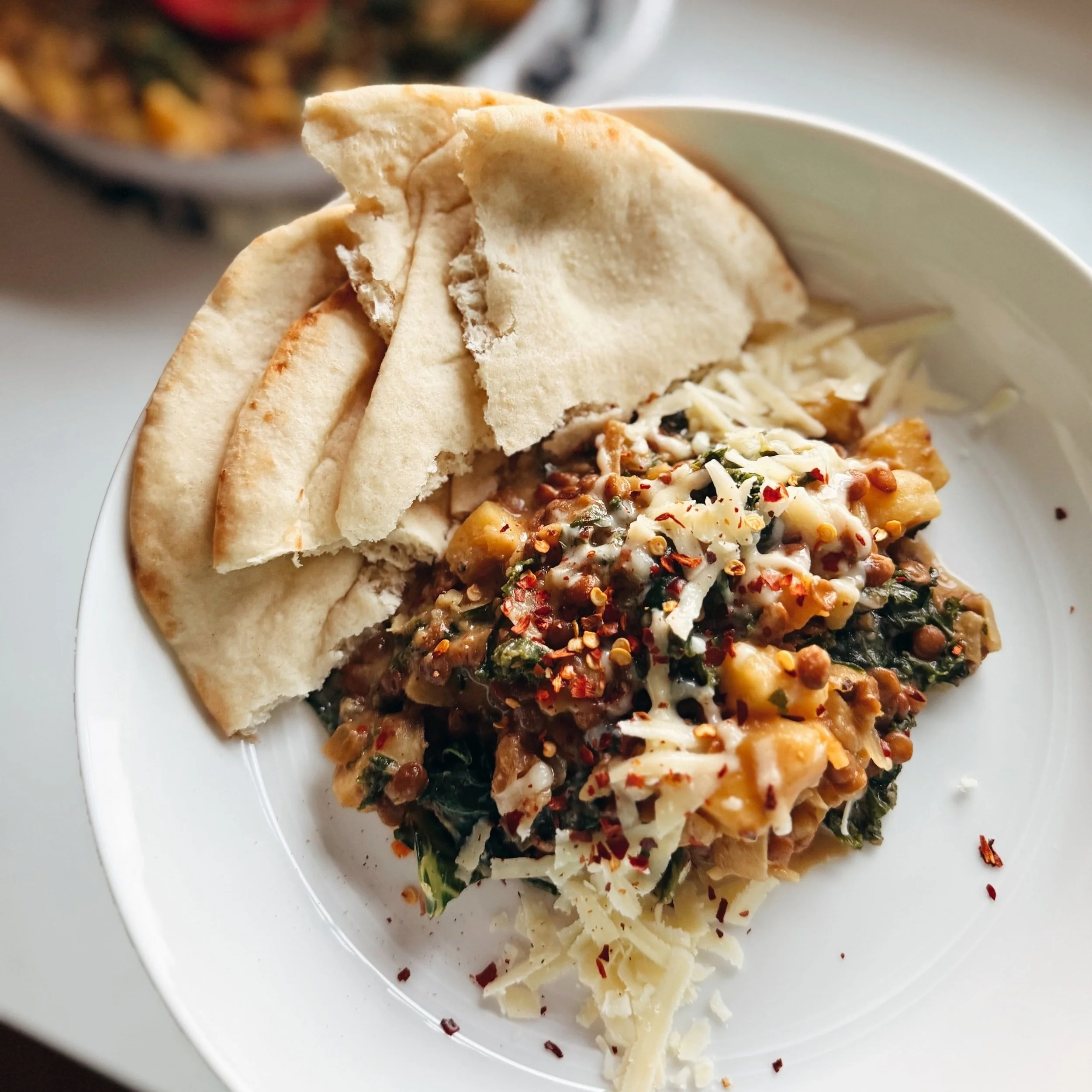 Serve in warmed bowls with soft pita nestled on the side, and a sprinkle of cheese + red pepper flakes on top.