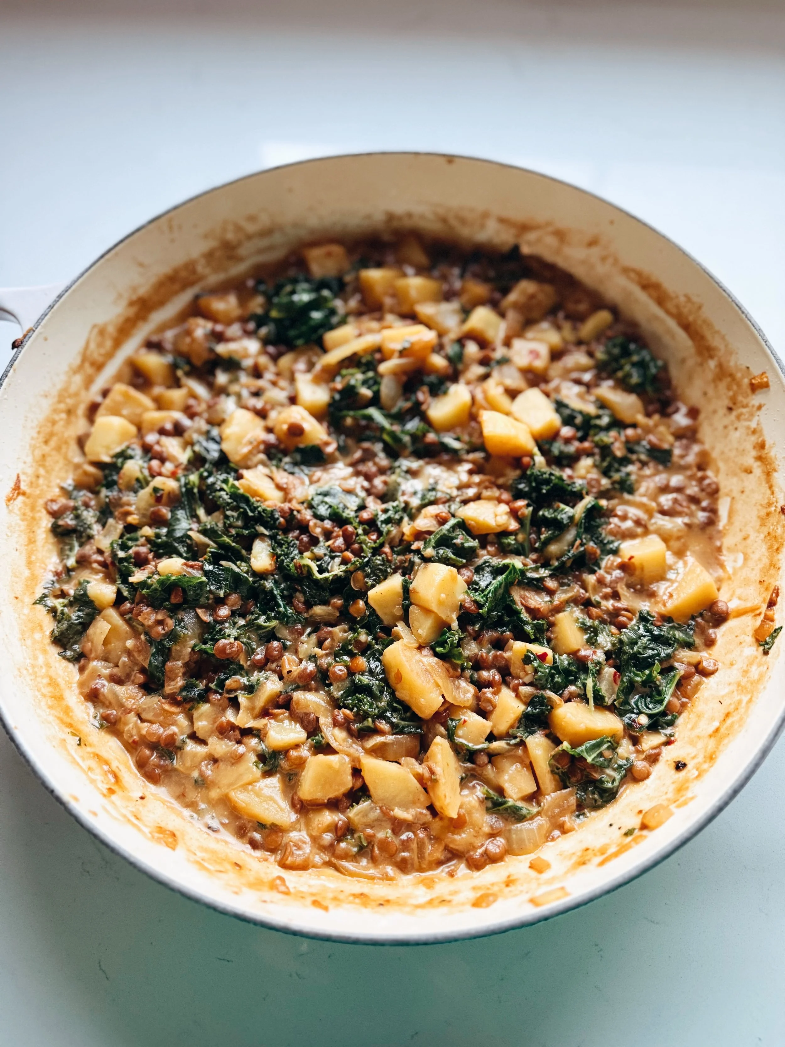 Start by placing a large skillet over medium heat. Add in the EVOO, garlic, and onions. Cook for about 10 minutes so the onions tenderize, stirring regularly. Add in the sweet potatos + cook for another 7-8 minutes. Stir in a pinch of salt + pepper. The sweet potatoes should be slightly brown + starting to tenderize. Add in the broth + cream, and bring the pot to a simmer. Let the broth simmer for 3-4 minutes stirring regularly. Stir in the nutritional yeast + lentils. Reduce the heat to low, add in the kale + red pepper flakes, and cover the pot. Let the kale cook for 5 minutes. Give the veggies a stir, uncover the pot, and let veggies cook an additional 5 minutes. If you feel like the mixture is too “soupy,” bring the mixture back to a simmer for the final 5 minutes of cooking. Keep over love heat until you’re ready to serve.
